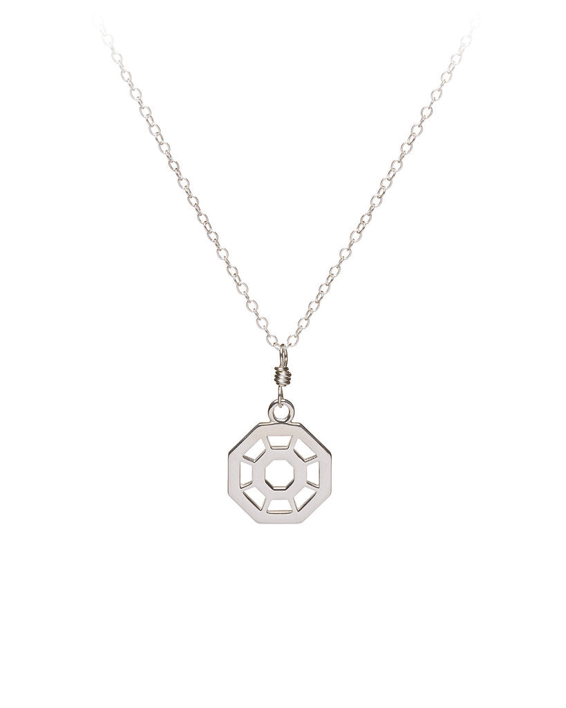 Sterling silver chain with sterling silver octagon pendant. Limited inventory remains. 16"-18" L (adjustable), pendant is 1/2" W